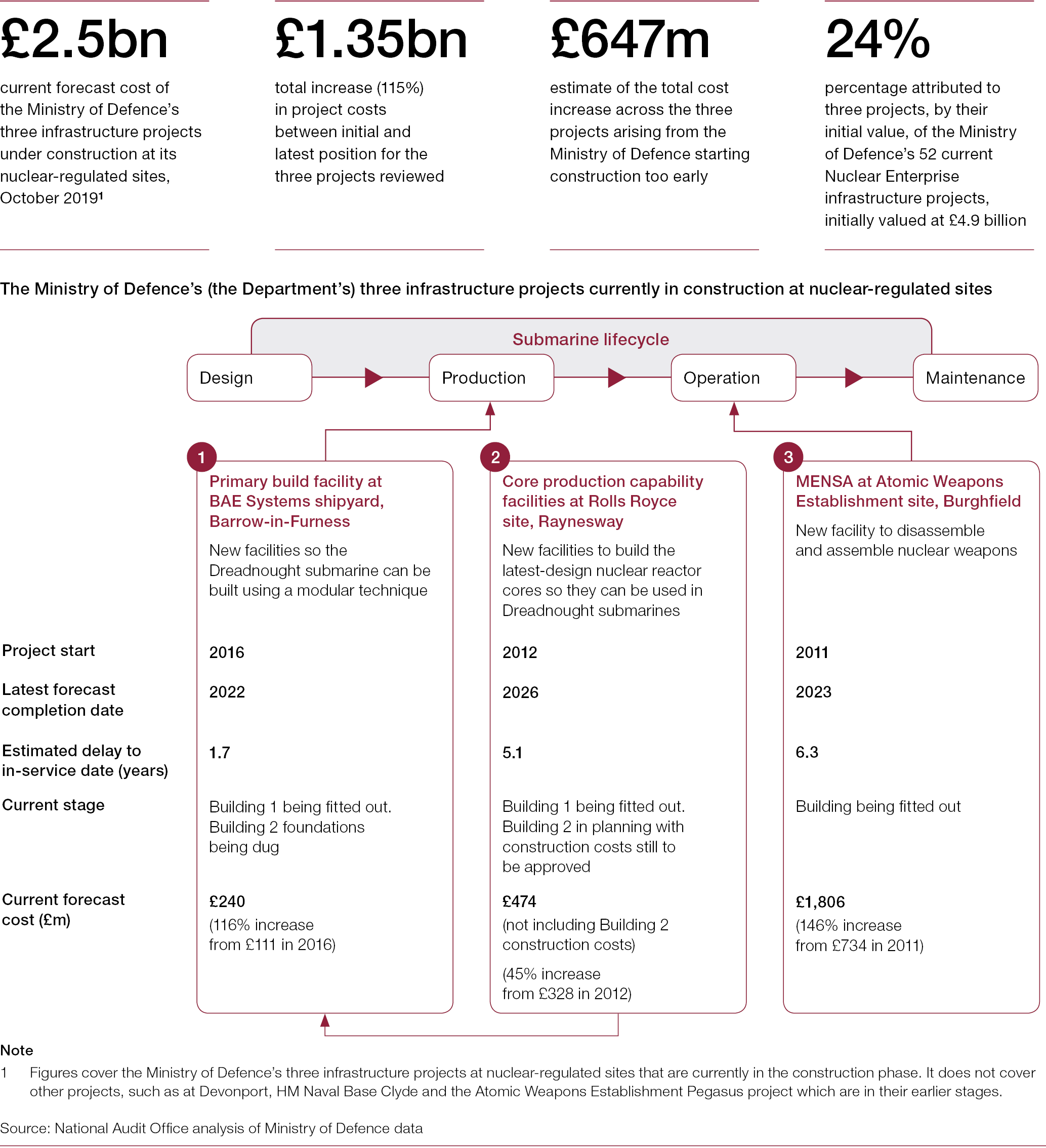 To maintain the continuous at sea deterrent, the Department must complete three critical infrastructure projects, valued at £2.5 billion, on its nuclear-regulated sites. It has made some progress, with the MENSA facility to assemble and disassemble nuclear weapons and the CPC facilities now taking shape. However, these three projects experienced problems in their earlier and riskier stages, with a cumulative £1.35 billion cost increase and delays of between 1.7 and 6.3 years. Given the interdependencies across different elements of the Nuclear Enterprise, such delays have broader implications which the Department must manage.